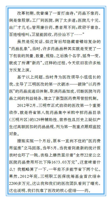 不過,這些所謂“難”,都不是裹足不前、無所作為的藉口。醫改確實不容易,但是還沒有難到無解的程度。只要下決心,都是可以解決的,三明就是其中一個突出例子。