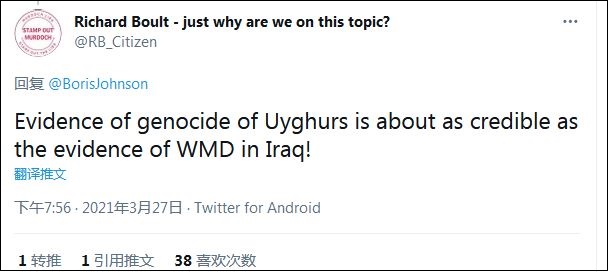 雖然他們推特下,不少人聽信西方媒體和政客的説辭,也聲援被中方制裁的議員,但更多人出於理性,以及對約翰遜政府的不信任,批評了他們的虛偽。