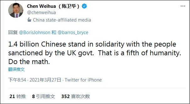 中國日報駐歐盟總部記者陳衞華就在約翰遜的推特下留言:“14億中國人堅定地支持被英國制裁的中國人,那是全人類數量的五分之一,你好好地算一算吧!”