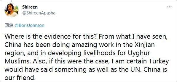 “證據在哪裏?據我所知,中國在新疆地區做了令人驚歎的工作,併為維吾爾人改善了生活。而且,如果真如你所説,我肯定土耳其和聯合國也會説點什麼。中國是我們的朋友。”