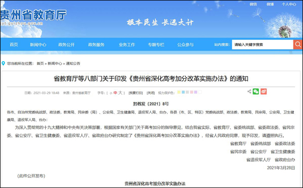 根據該辦法,貴州省高考全國性加分項目中,除烈士子女考生加分、在服役期間榮立二等功及以上或被戰區及以上單位授予榮譽稱號的退役軍人考生加分、自主就業的退役士兵考生加分等分值不變外,歸僑、華僑子女、歸僑子女和台灣省籍考生(含台灣户籍考生)加分分值由10分調整為5分。