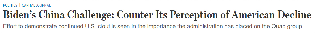 《華爾街日報》華盛頓執行主編傑拉德·塞布(Gerald Seib)29日在該報撰文稱,拜登的對華政策挑戰、所謂中美關係的“最大風險”,便是中國“相信美國正在衰落”,以及為此採取的行動。