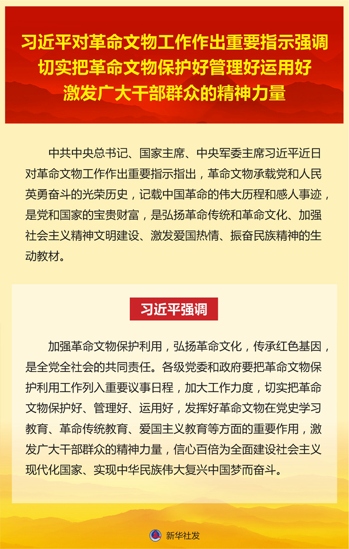 習近平強調,加強革命文物保護利用,弘揚革命文化,傳承紅色基因,是全黨全社會的共同責任。各級黨委和政府要把革命文物保護利用工作列入重要議事日程,加大工作力度,切實把革命文物保護好、管理好、運用好,發揮好革命文物在黨史學習教育、革命傳統教育、愛國主義教育等方面的重要作用,激發廣大幹部羣眾的精神力量,信心百倍為全面建設社會主義現代化國家、實現中華民族偉大復興中國夢而奮鬥。