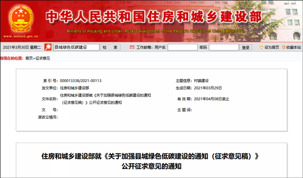 住房和城鄉建設部網站3月29日消息,住房和城鄉建設部網站發佈通知,就《關於加強縣城綠色低碳建設的意見(徵求意見稿)》(下稱《意見》)公開徵求意見。