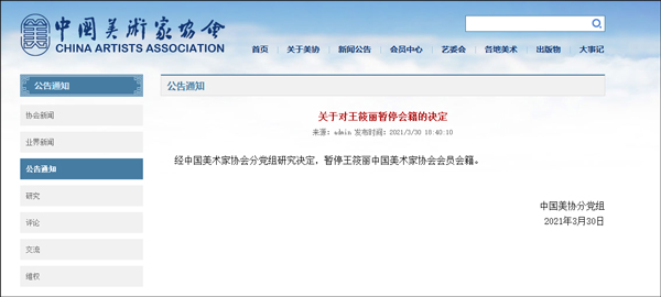 中國美術家協會網站消息,3月30日,中國美協分黨組發佈關於對王筱麗暫停會籍的決定: