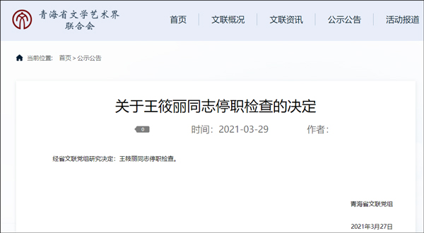 此前,3月27日,青海省文聯黨組也已發佈公告稱: