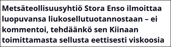 “斯道拉恩索宣佈放棄溶解木漿生產,拒絕評論關於中國供應的‘道德’問題”,YLE報道截圖