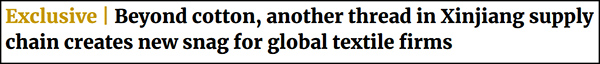 就在斯道拉恩索公司通過郵件宣佈退出溶解木漿行業的一天前(28日),《南華早報》曾發佈過一篇題為“除了棉花,新疆的另一條供應鏈給全球紡織業帶來新的障礙”的文章,對新疆地區粘膠纖維產業供應鏈進行了“追溯調查”。