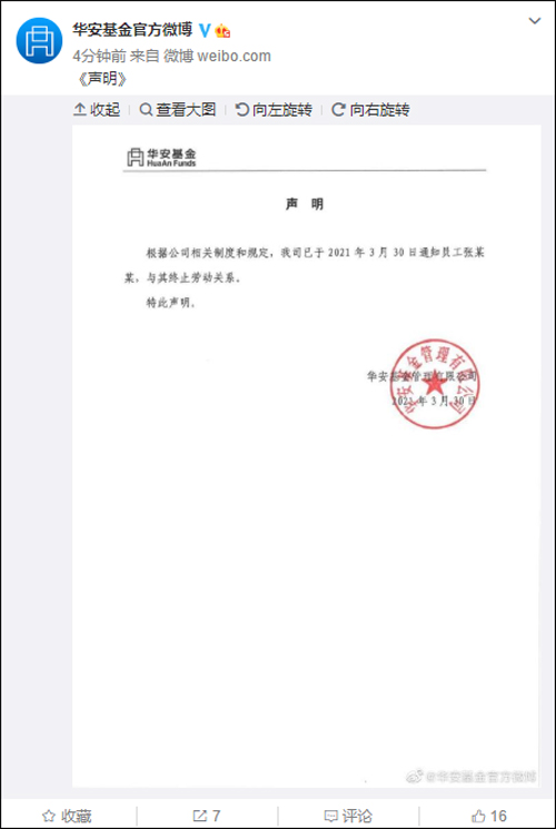 3月30日晚,@華安基金官方微博 發佈聲明稱,根據公司相關制度和規定,該公司已於2021年3月30日通知員工張某某,與其終止勞動關係。