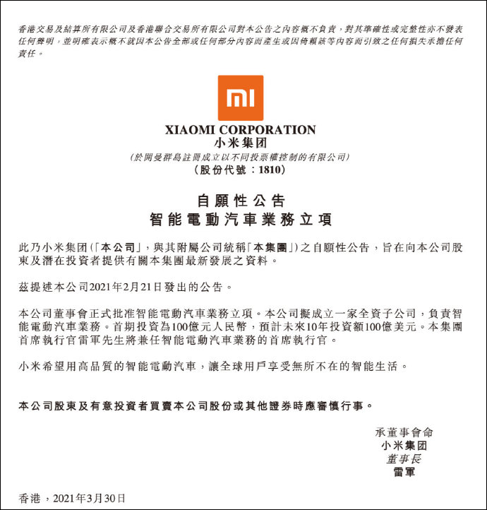 3月30日下午,小米集團向港交所提交正式公告,小米董事會已正式批准智能電動汽車業務立項,由雷軍本人親自掛帥。