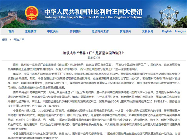 3月31日,中華人民共和國駐比利時王國大使館刊登了一篇題為《追求成為“世界工廠”是否是中國的選擇?》的文章。