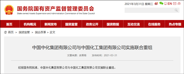 國務院國有資產監督管理委員會網站消息,經報國務院批准,中國中化集團有限公司與中國化工集團有限公司實施聯合重組。