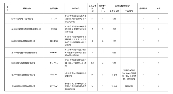 北汽福田汽車股份有限公司一型號規格的不合格項是休眠功能。深圳友浩車聯網股份有限公司一型號規格的不合格項包括多中心接入功能、監聽功能、駕駛員身份識別、定位功能、區域提醒、路線偏離提醒、盲區補報功能、車輛can總線數據上傳。