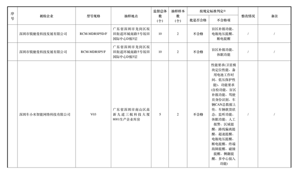 從被檢企業的不合格項來看,例如深圳車小米智能網絡科技有限公司一型號規格抽樣樣本不合格,不合格項包括性能要求和功能要求。其中性能要求包括衞星模塊定位性能、備用電池工作時間、低壓保護性能;功能要求包括自檢功能、盲區補報功能、駕駛員身份識別、車輛CAN總數據上傳、車輛載貨狀態、監聽功能、休眠功能、人工報警、區域提醒、路線偏離提醒、超速提醒、電瓶電壓提醒、斷電提醒、終端故障提醒、碰撞提醒、側翻提醒、多中心接入功能。