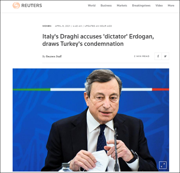 因為到訪土耳其的歐盟委員會主席馮德萊恩沒有得到自己的“座位”,意大利總理馬里奧·德拉吉8日批評土耳其“一些人”為“獨裁者”。土耳其恰武什奧盧隨即公開發聲譴責,土外交部還召見了意大利大使。同時土耳其將這一口大鍋甩給了歐盟,稱這是歐盟方面的“指示”。