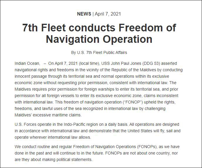 觀察者網還注意到,同日,美軍也發了一份類似的聲明,稱美軍在馬爾代夫的專屬經濟區,也進行了無害通過和常規行動。