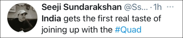 一位網民諷刺入肉,“印度第一次嚐到加入‘四國機制’(QUAD)的真正滋味。”