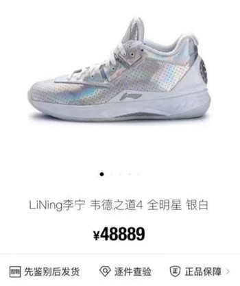 相較於前兩者,價格變化方面更令人瞠目結舌的是李寧“韋德之道4全明星銀白款”,該款產品發售價為1499元,而近段時間售價已至48889元,漲幅高達31倍![1]甚至有消息稱,前述的“李寧韋德之道4全明星銀白款”,甚至曾翻番六十倍,以八萬餘元的價格售出![2]