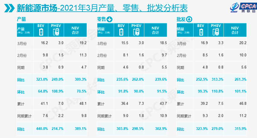 最後我們再來聚焦新能源汽車市場,相比整個乘用車市場,新能源汽車市場成為國內汽車市場新的增長點。數據顯示,3月新能源車零售端銷量為18.5萬輛,同比增長239.6%;批發銷量為20.2萬輛,增幅為261.3%。