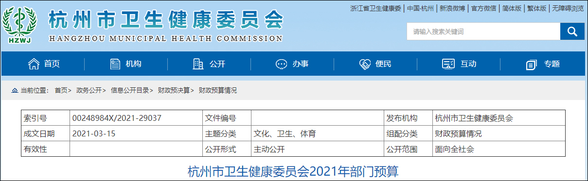 杭州市衞健委則於3月15日公開2021年部門預算,納入了杭州市第一人民醫院等30家預算單位。