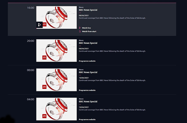 報道稱,BBC取消了BBC1、BBC2和新聞頻道的預定節目,轉而播出一檔名為《愛丁堡公爵》(HRH The Duke of Edinburgh)的特別節目。就連原定於晚上8點半播出的備受期待的《廚藝大師》(MasterChef)決賽也被取消。隨後,BBC又在晚上9點再次向愛丁堡公爵致敬。11點30分,悼念活動再一次在BBC1和BBC2重播。
