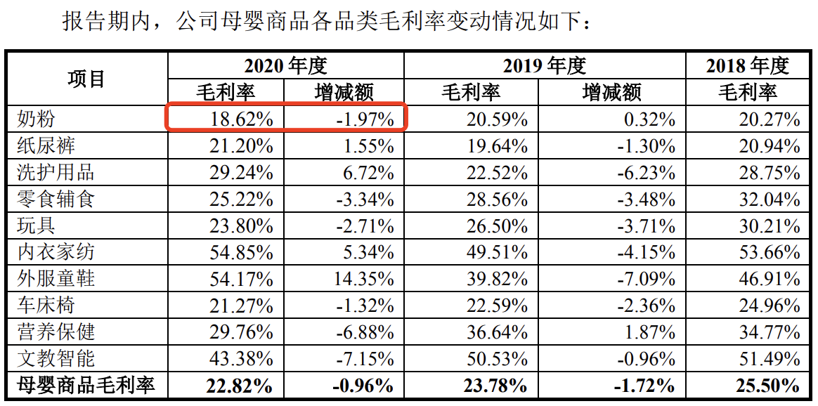不過,奶粉的毛利率卻從2018年的20.27%下降至2020年的18.62%。