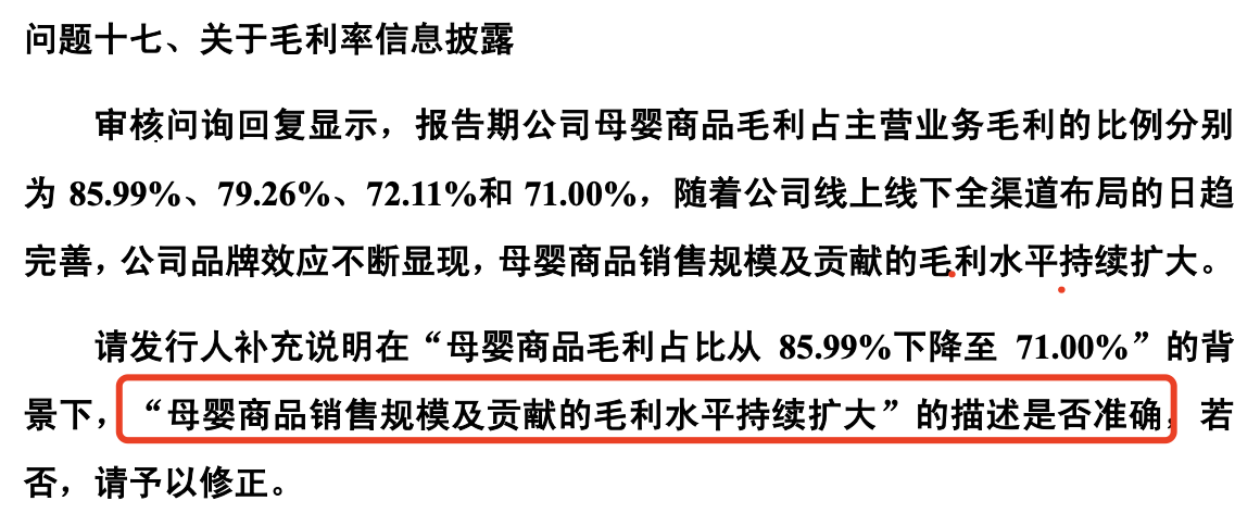 這一説法隨後遭到質疑,交易所要求孩子王説明“母嬰商品銷售規模及貢獻的毛利水平持續擴大”的描述是否準確。