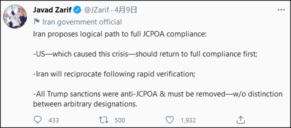 4月7日,美國國務院曾表態稱,美國願意取消對伊朗的制裁,包括與伊核協議內容無關的制裁以重返伊核協議,但美方並未透露具體的細節。
