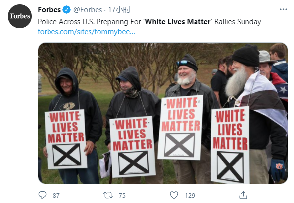 就在近日,有媒體注意到,有人在社交網站喊出了“白人的命也是命”的口號,該話題一度登上了推特美國區熱搜榜。緊接着,一個號稱為“草根”(grassroots)的聯盟計劃在全美多個城市舉行示威遊行,時間統一定為4月11日,並強調,遊行者不應使用“仇恨的口號和標語”。
