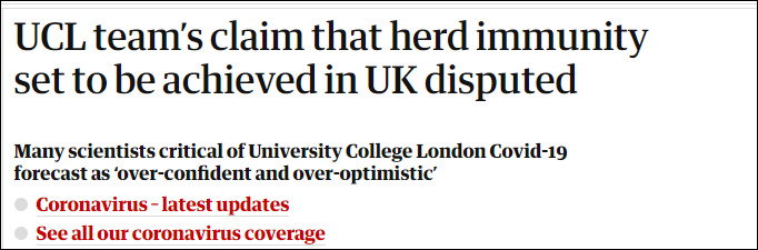 倫敦大學學院的這一觀點隨後被不少科學家所質疑,有科學家認為,確診過新冠的人對於新冠的免疫力會隨着時間推移而下降,因此英國距離“羣體免疫”仍很遙遠。