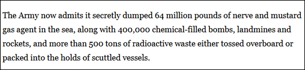 2004年,一支美國施工隊在新澤西州海岸附近,挖出了一枚第一次世界大戰時期的芥子氣炮彈。最終,美國軍方於2005年承認,他們在1944年至1970年間,共向海洋傾倒了6400萬磅(約2.9萬噸)神經毒氣和芥子氣毒劑、40萬個化學毒劑爆炸物,及超過500噸放射性廢料。