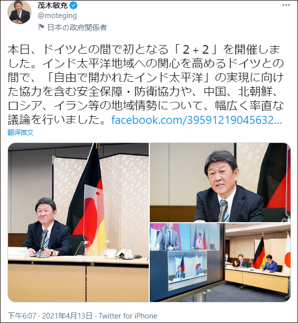 當地時間4月13日,日本外相茂木敏光、防務大臣岸信夫與德國外長馬斯、防長克蘭普-卡倫鮑爾舉行視頻會晤。會議上,雙方一致同意將加強兩國間安全合作。