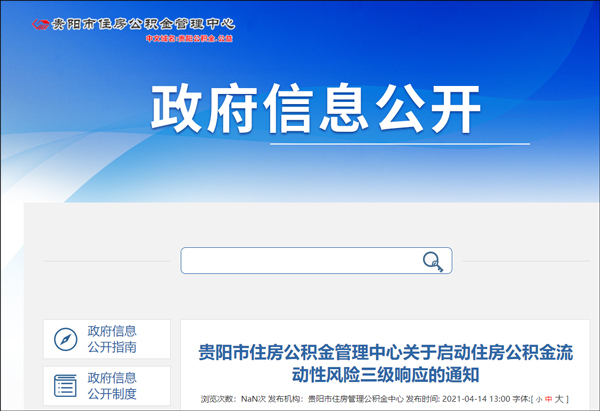 4月14日,貴州省貴陽市住房公積金管理中心網站發佈通知,啓動住房公積金流動性風險三級響應。