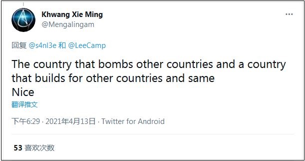 一位推特網民對比説:“這個國家轟炸別國,一個國家為別國建設。漂亮(對比)。”