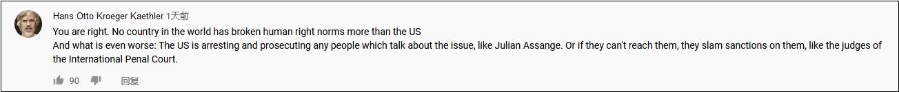 “你是對的。世界上沒有哪個國家比美國更違反人權準則。更糟糕的是:美國正逮捕和起訴任何談論這個問題的人,比如朱利安·阿桑奇。如果美國找不到這些人,就會像國際刑事法庭的法官那樣嚴厲制裁他們。”