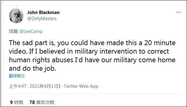 “中國有色人種被警察射殺的概率是白人的三倍。美國!美國!又是美國!”他接着説道,“我發誓,這次説的一定是中國了,中國把疫苗和醫療資源作為武器,將那些敵對國家拒之門外,此時我們應該專注於普世人道主義,而不是有毒的民族主義,更不用説他們把難民兒童關在籠子裏了。”