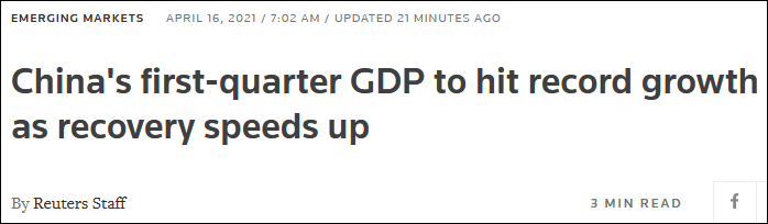 路透社就指出,受國內外需求強勁以及政府對小微企業持續支持等事件推動和影響,中國一季度GDP和去年年初遭受疫情衝擊時相比,將實現大幅反彈。報道還預測,這一增幅數字將會是自1992年有季度數據以來,最為強勁的一次。