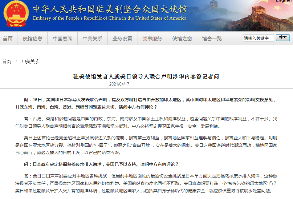 中國駐美大使館網站4月17日發佈《駐美使館發言人就美日領導人聯合聲明涉華內容答記者問》,以下為文章全文: