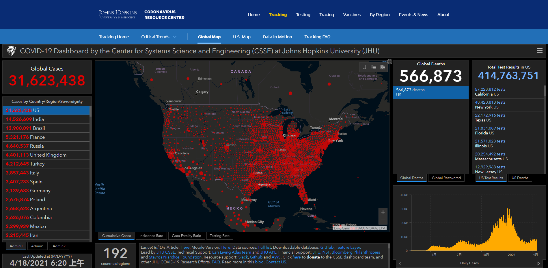(觀察者網訊)根據美國約翰斯·霍普金斯大學統計數據,截至北京時間2021年4月18日6時20分,美國新冠肺炎累計確診病例31623438例,累計死亡病例566873例。在過去約24小時裏,美國新增確診病例58176例,新增死亡病例785例。
