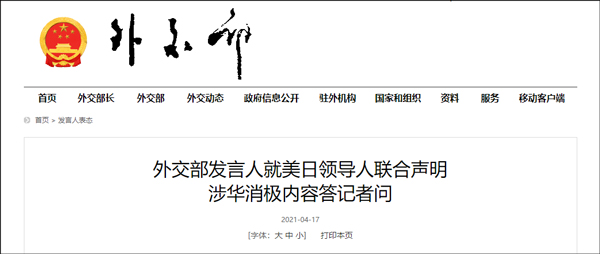 外交部網站4月17日消息,外交部發言人就美日領導人聯合聲明涉華消極內容答記者問。