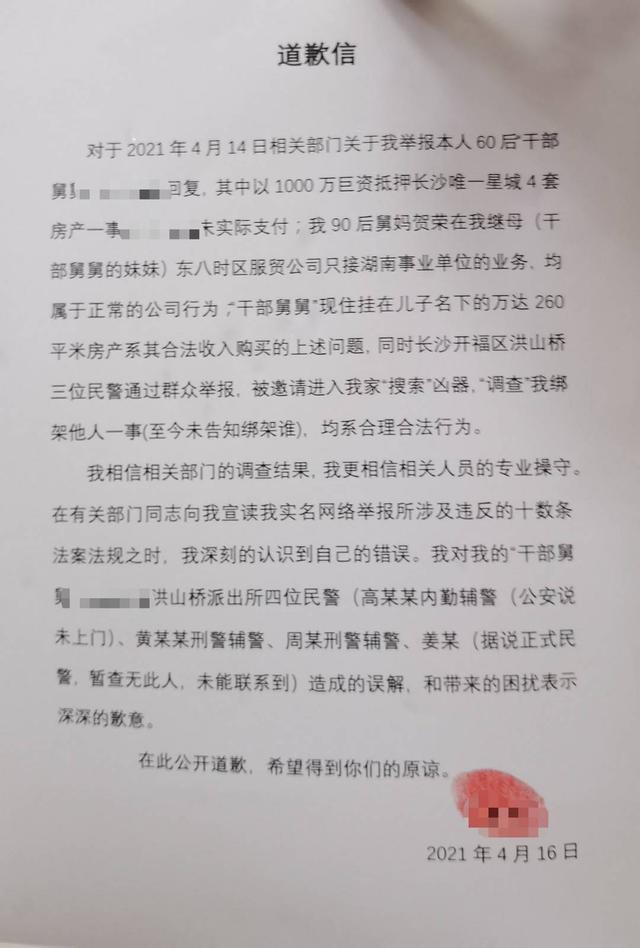 同時,該道歉信還顯示,在紀委通報情況後,公安部門也對其通報了民警上門調查一事,也進行了回覆,稱長沙開福區洪山橋三位民警因羣眾舉報,進入他家調查綁架一事,均系合理合法行為。