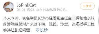 4月1日,網友“jopinkCat” 在微博稱,實名舉報長沙市某單位的金某輝和他親妹妹涉嫌鉅額財產來源不明、違規插手工程等違法亂紀問題。長沙市紀委監委隨後發文,稱按相關規定和程序要求對舉報人反映的問題啓動了調查,相關情況正在調查核實中。