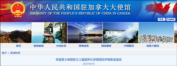 中國駐加拿大大使館網站4月18日消息,駐加拿大使館發言人就加外長涉港錯誤聲明發表談話: