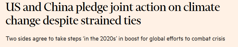 《金融時報》:儘管存在緊張分歧,中美仍發表了氣候變化問題共同聲明