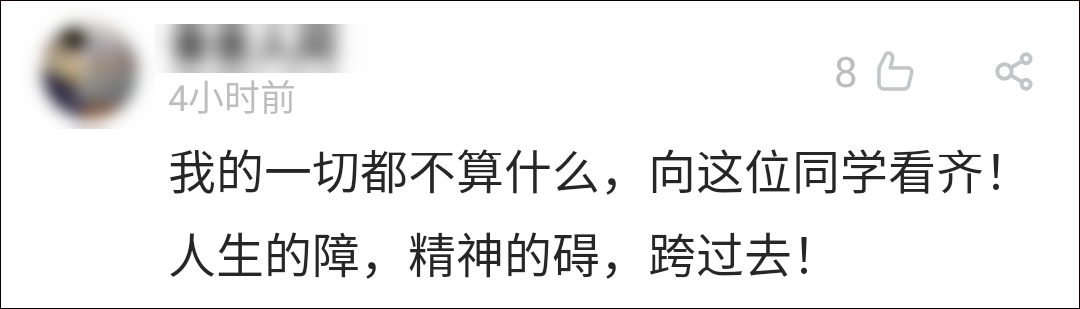 也有人見賢思齊,稱:“我的一切都不算什麼,向這位同學看齊!人生的障,精神的礙,跨過去!”