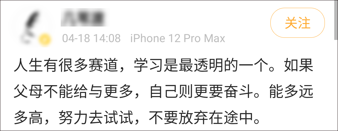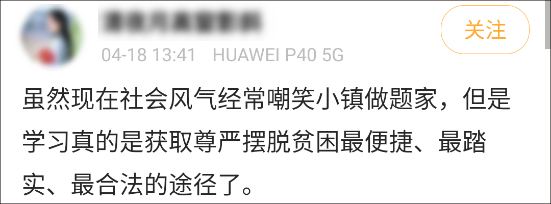 該網友稱:“雖然現在社會風氣經常嘲笑小鎮做題家,但是學習真的是獲取尊嚴、擺脱貧困最便捷、最踏實、最合法的途徑了。”