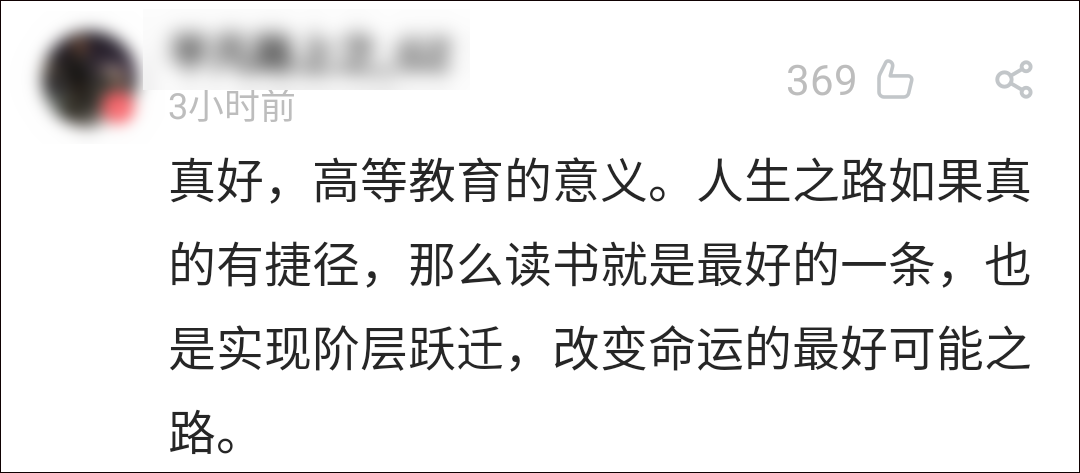 “真好,高等教育的意義。人生之路如果真的有捷徑,那麼讀書就是最好的一條,也是實現階層躍遷,改變命運的最好可能之路。”