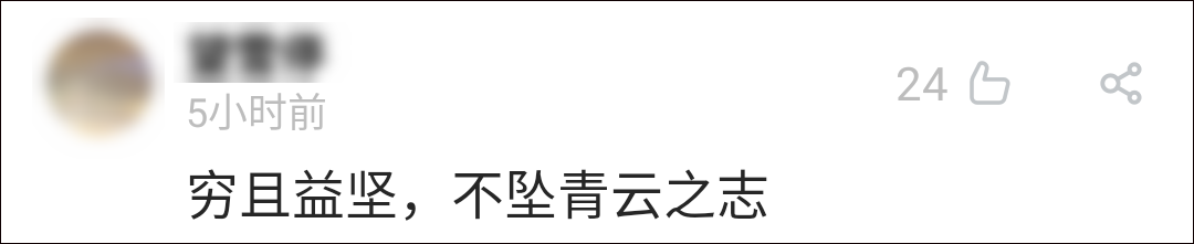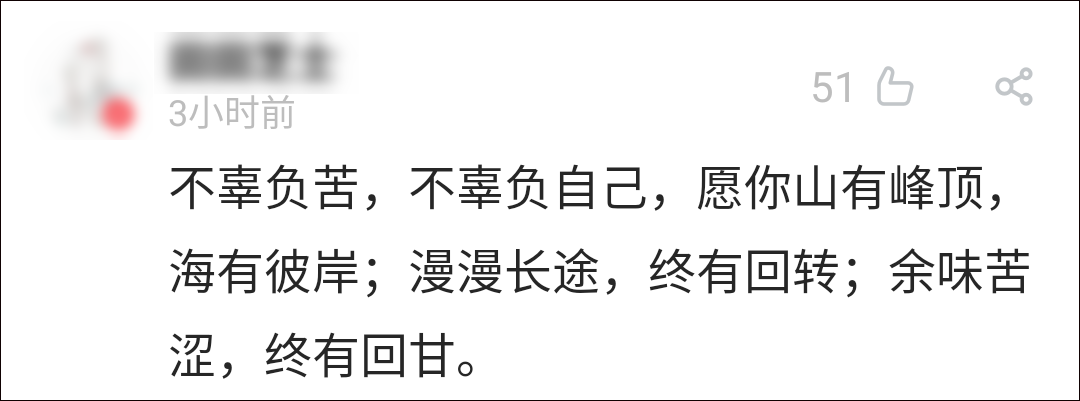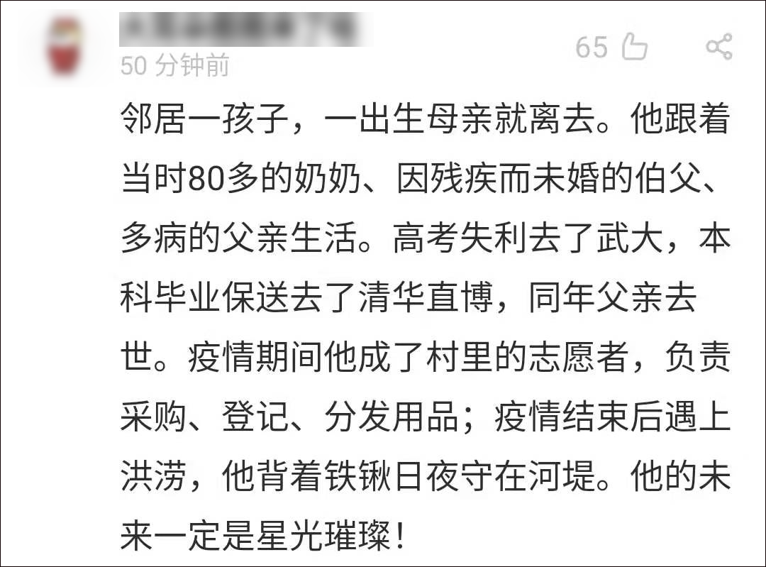 一名網友分享了一件類似的故事:“鄰居一孩子,一出生母親就離去。他跟着當時80多的奶奶、因殘疾而未婚的伯父、多病的父親生活。高考失利去了武大,本科畢業保送去了清華直博,同年父親去世。疫情期間他成了村裏的志願者,負責採購、登記、分發用品;疫情結束後遇上洪澇,他揹着鐵鍬日夜守在河堤。他的未來一定是星光璀璨!”
