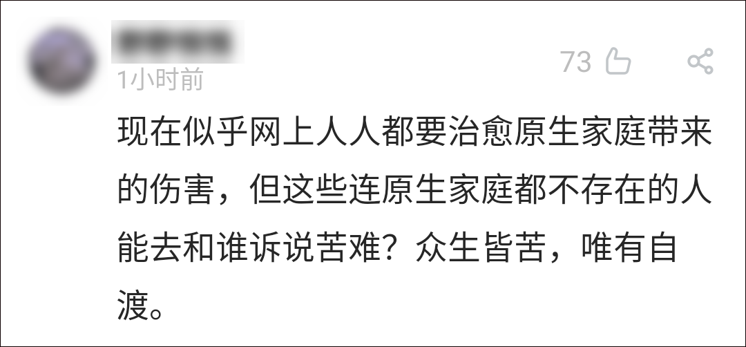 對於形形色色人生中的苦,有人感概稱,現在似乎網上人人都要治癒原生家庭帶來的傷害,但這些連原生家庭都不存在的人能去和誰訴説苦難?“眾生皆苦,唯有自渡”。