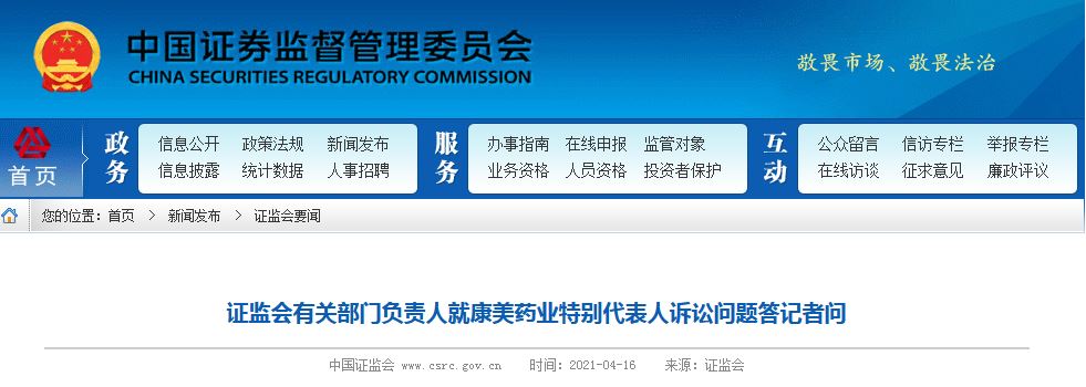 2020年5月,證監會對康美藥業信息披露違法違規行為作出行政處罰及市場禁入決定,公司及相關人員涉嫌犯罪行為被移送司法機關。康美藥業公司2016年至2018年連續3年有預謀、有組織、系統性實施財務造假約300億,涉案金額巨大,持續時間長,性質特別嚴重,社會影響惡劣,踐踏法治,對市場和投資者毫無敬畏之心,嚴重損害了投資者的合法權益,嚴重破壞資本市場健康生態。投資者保護機構充分響應市場呼聲,依法接受投資者委託,作為代表人參加康美藥業代表人訴訟。證監會對此表示支持,並將依法對投資者保護機構參與訴訟工作進行監督,切實保障投資者合法權益。